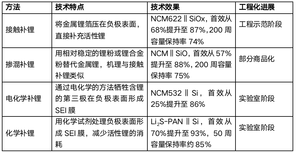 負極預鋰化中的接觸和摻混補鋰的容量高,技術成熟度相對較高,但是成本投入較大,技術改造難度較大,操作復雜,對環境要求高,有一定安全風險。在解決了工程應用過程中潛在安全隱患,攻克材料?工藝?設備等方面的技術難點后具備更大的發展潛力。