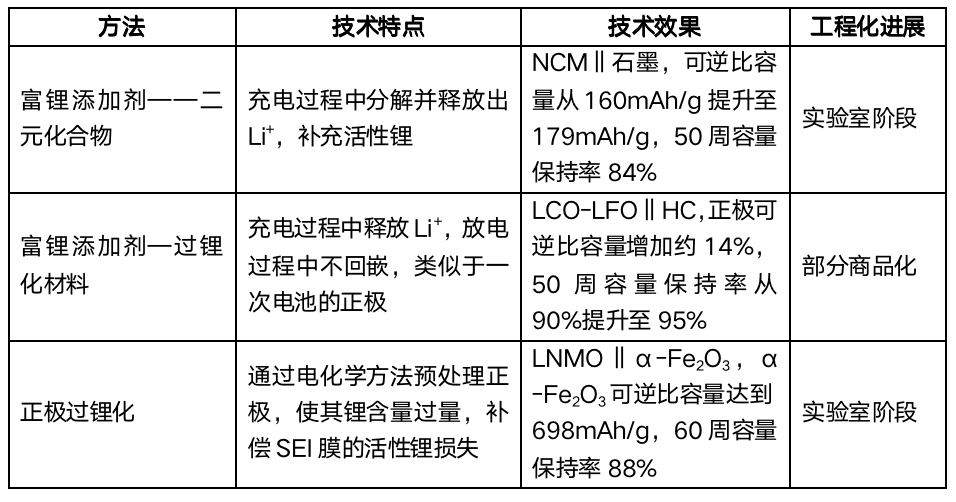 正極預鋰化是指通過額外添加的活性鋰源,來補償不可逆的活性鋰損失,確保電池內活性鋰的充足。相較于流程復雜?安全風險高,且對環境和工藝要求較高的負極預鋰化技術,目前研究較多的正極預鋰化技術集中在高性價比的富鋰添加劑開發方面。